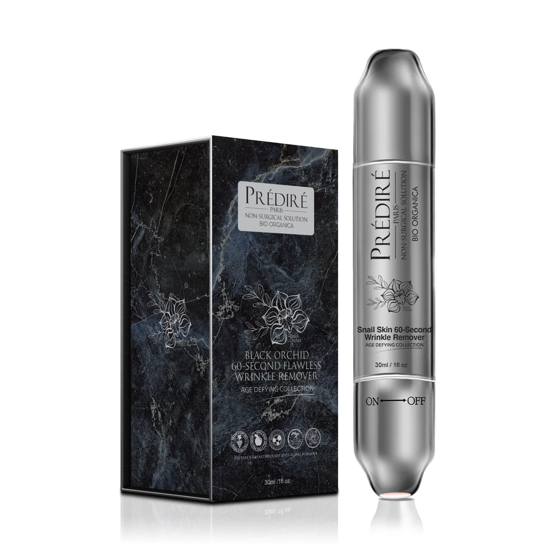 As we age, the skinsβ elastin fibers work less efficiently than they used to, resulting in fine lines and wrinkles. The Predire Paris Black Orchid 60 Second Flawless Wrinkle Remover restores the skin renewal process by stimulating facial cells, and promotes the tightening, lifting, and firming of the skin. Resulting in a healthier and more youthful appearance. Formulated with an organic blend of minerals combined with the restoring properties of resurgent stems cells from the whole grape and apple plant, to moisturize, and energize the layers of the skin on a molecular level. Helping to revive the skin and combat the signs of aging, diminishing fine lines and wrinkles for a radiant, and vibrant luster.